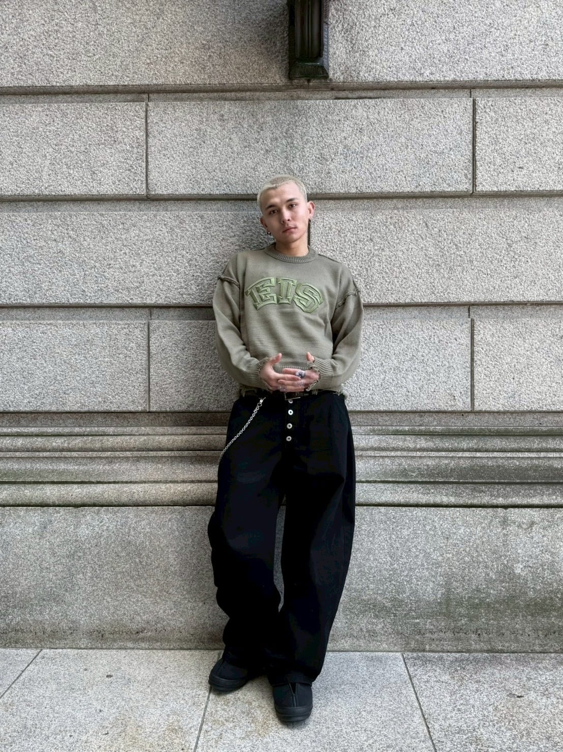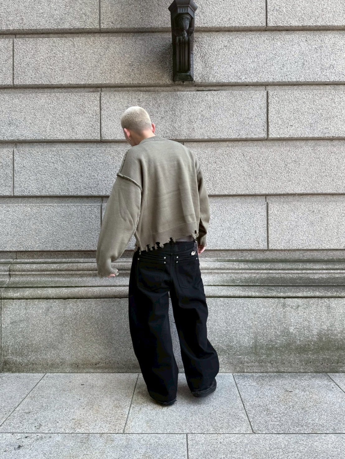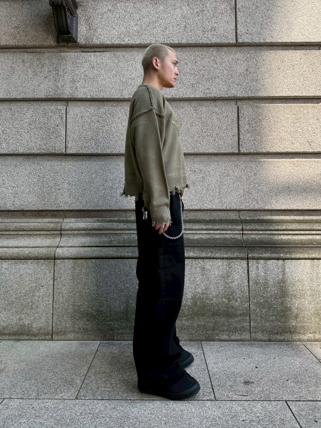 袖口、裾に絶妙なほつれやクラッシュ加工を施し、短丈で身幅のルーズシルエットで、レザーパンツ、デニム、トレンドのワイドパンツまで幅広く合わせやすい1着となっています。